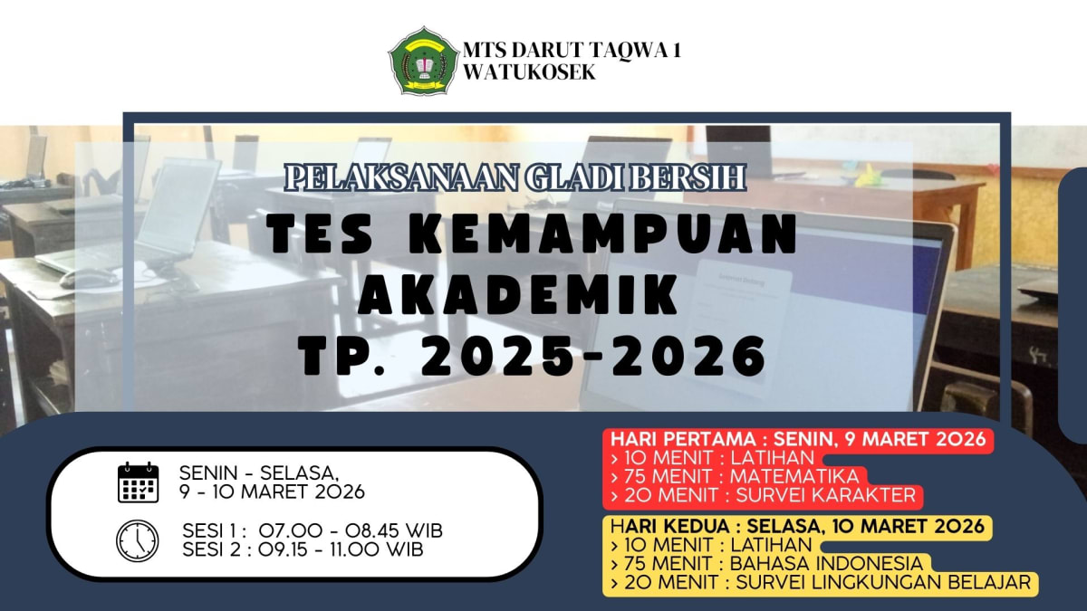 WATUKOSEK – Dalam rangka pemetaan mutu pendidikan dan evaluasi capaian belajar siswa, MTs Darut Taqwa 1 Watukosek akan melaksanakan Tes Kemampuan Akademik (TKA) tahun pelajaran 2025/2026. Kegiatan ini merupakan agenda penting yang wajib diikuti oleh seluruh siswa sesuai jadwal yang telah ditentukan.